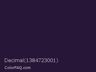 Decimal 1384723001 Color is a very dark purple color and the nearest color is Revolver #2c1632. Hex code #271637 and RGB value is rgb(39,22,55). In RGB color space, this color is composed of 15% red, 9% green, 22% blue, In CMYK color space, this color is composed of 29% cyan, 60% magenta, 0% yellow , 78% black , In HSL color space, this color has a hue angle of 271° , 43% saturation and 15% lightness.