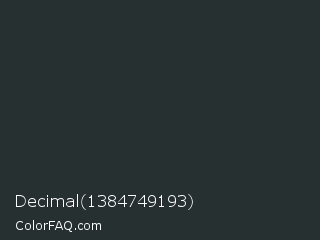 Decimal 1384749193 Color is a very dark cyan color and the nearest color is Charleston Green #232b2b. Hex code #273031 and RGB value is rgb(39,48,49). In RGB color space, this color is composed of 15% red, 19% green, 19% blue, In CMYK color space, this color is composed of 20% cyan, 2% magenta, 0% yellow , 81% black , In HSL color space, this color has a hue angle of 186° , 11% saturation and 17% lightness.