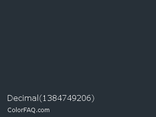 Decimal 1384749206 Color is a very dark blue color and the nearest color is Gunmetal #2a3439. Hex code #273038 and RGB value is rgb(39,48,56). In RGB color space, this color is composed of 15% red, 19% green, 22% blue, In CMYK color space, this color is composed of 30% cyan, 14% magenta, 0% yellow , 78% black , In HSL color space, this color has a hue angle of 208° , 18% saturation and 19% lightness.