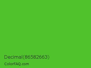 Decimal 86582663 Color is a normal green color and the nearest color is Kelly Green #4cbb17. Hex code #50c22b and RGB value is rgb(80,194,43). In RGB color space, this color is composed of 31% red, 76% green, 17% blue, In CMYK color space, this color is composed of 59% cyan, 0% magenta, 78% yellow , 24% black , In HSL color space, this color has a hue angle of 105° , 64% saturation and 46% lightness.