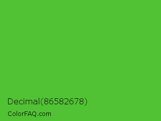 Decimal 86582678 Color is a normal green color and the nearest color is Apple #4fa83d. Hex code #50c234 and RGB value is rgb(80,194,52). In RGB color space, this color is composed of 31% red, 76% green, 20% blue, In CMYK color space, this color is composed of 59% cyan, 0% magenta, 73% yellow , 24% black , In HSL color space, this color has a hue angle of 108° , 58% saturation and 48% lightness.