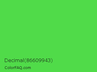 Decimal 86609943 Color is a normal green color and the nearest color is Lime Green #32cd32. Hex code #50db49 and RGB value is rgb(80,219,73). In RGB color space, this color is composed of 31% red, 86% green, 29% blue, In CMYK color space, this color is composed of 63% cyan, 0% magenta, 67% yellow , 14% black , In HSL color space, this color has a hue angle of 117° , 67% saturation and 57% lightness.