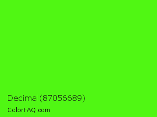 Decimal 87056689 Color is a normal green color and the nearest color is Chlorophyll Green #4aff00. Hex code #50f713 and RGB value is rgb(80,247,19). In RGB color space, this color is composed of 31% red, 97% green, 7% blue, In CMYK color space, this color is composed of 68% cyan, 0% magenta, 92% yellow , 3% black , In HSL color space, this color has a hue angle of 104° , 93% saturation and 52% lightness.