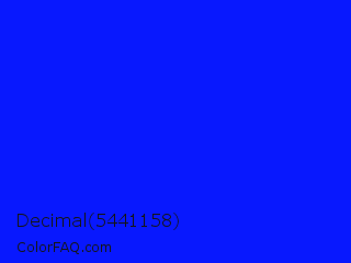 Decimal 5441158 Color is a normal blue color and the nearest color is Bluebonnet #1c1cf0. Hex code #0818fe and RGB value is rgb(8,24,254). In RGB color space, this color is composed of 3% red, 9% green, 100% blue, In CMYK color space, this color is composed of 97% cyan, 91% magenta, 0% yellow , 0% black , In HSL color space, this color has a hue angle of 236° , 99% saturation and 51% lightness.
