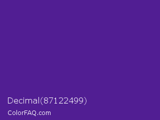 Decimal 87122499 Color is a normal violet color and the nearest color is Daisy Bush #4f2398. Hex code #511e93 and RGB value is rgb(81,30,147). In RGB color space, this color is composed of 32% red, 12% green, 58% blue, In CMYK color space, this color is composed of 45% cyan, 80% magenta, 0% yellow , 42% black , In HSL color space, this color has a hue angle of 266° , 66% saturation and 35% lightness.