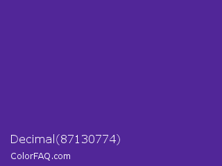 Decimal 87130774 Color is a normal violet color and the nearest color is Daisy Bush #4f2398. Hex code #512698 and RGB value is rgb(81,38,152). In RGB color space, this color is composed of 32% red, 15% green, 60% blue, In CMYK color space, this color is composed of 47% cyan, 75% magenta, 0% yellow , 40% black , In HSL color space, this color has a hue angle of 263° , 60% saturation and 37% lightness.