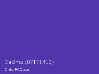 Decimal 87171413 Color is a normal indigo color and the nearest color is Ocean Blue #4f42b5. Hex code #5135ab and RGB value is rgb(81,53,171). In RGB color space, this color is composed of 32% red, 21% green, 67% blue, In CMYK color space, this color is composed of 53% cyan, 69% magenta, 0% yellow , 33% black , In HSL color space, this color has a hue angle of 254° , 53% saturation and 44% lightness.