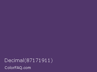 Decimal 87171911 Color is a normal purple color and the nearest color is Imperial #602f6b. Hex code #51366b and RGB value is rgb(81,54,107). In RGB color space, this color is composed of 32% red, 21% green, 42% blue, In CMYK color space, this color is composed of 24% cyan, 50% magenta, 0% yellow , 58% black , In HSL color space, this color has a hue angle of 271° , 33% saturation and 32% lightness.
