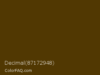 Decimal 87172948 Color is a very dark orange color and the nearest color is Saddle Brown #583401. Hex code #513802 and RGB value is rgb(81,56,2). In RGB color space, this color is composed of 32% red, 22% green, 1% blue, In CMYK color space, this color is composed of 0% cyan, 31% magenta, 98% yellow , 68% black , In HSL color space, this color has a hue angle of 41° , 95% saturation and 16% lightness.