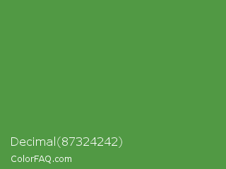 Decimal 87324242 Color is a normal green color and the nearest color is May Green #4c9141. Hex code #519944 and RGB value is rgb(81,153,68). In RGB color space, this color is composed of 32% red, 60% green, 27% blue, In CMYK color space, this color is composed of 47% cyan, 0% magenta, 56% yellow , 40% black , In HSL color space, this color has a hue angle of 111° , 38% saturation and 43% lightness.