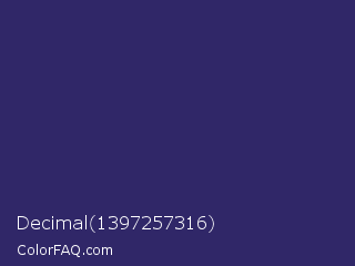 Decimal 1397257316 Color is a dark indigo color and the nearest color is Jacarta #3a2a6a. Hex code #302768 and RGB value is rgb(48,39,104). In RGB color space, this color is composed of 19% red, 15% green, 41% blue, In CMYK color space, this color is composed of 54% cyan, 63% magenta, 0% yellow , 59% black , In HSL color space, this color has a hue angle of 248° , 45% saturation and 28% lightness.