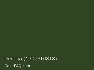 Decimal 1397310818 Color is a very dark green color and the nearest color is Kombu Green #354230. Hex code #304322 and RGB value is rgb(48,67,34). In RGB color space, this color is composed of 19% red, 26% green, 13% blue, In CMYK color space, this color is composed of 28% cyan, 0% magenta, 49% yellow , 74% black , In HSL color space, this color has a hue angle of 95° , 33% saturation and 20% lightness.
