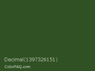 Decimal 1397326151 Color is a dark green color and the nearest color is Mughal Green #306030. Hex code #305123 and RGB value is rgb(48,81,35). In RGB color space, this color is composed of 19% red, 32% green, 14% blue, In CMYK color space, this color is composed of 41% cyan, 0% magenta, 57% yellow , 68% black , In HSL color space, this color has a hue angle of 103° , 40% saturation and 23% lightness.
