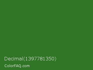Decimal 1397781350 Color is a dark green color and the nearest color is Bilbao #327c14. Hex code #307526 and RGB value is rgb(48,117,38). In RGB color space, this color is composed of 19% red, 46% green, 15% blue, In CMYK color space, this color is composed of 59% cyan, 0% magenta, 68% yellow , 54% black , In HSL color space, this color has a hue angle of 112° , 51% saturation and 30% lightness.