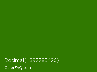 Decimal 1397785426 Color is a dark green color and the nearest color is Napier Green #2a8000. Hex code #307900 and RGB value is rgb(48,121,0). In RGB color space, this color is composed of 19% red, 47% green, 0% blue, In CMYK color space, this color is composed of 60% cyan, 0% magenta, 100% yellow , 53% black , In HSL color space, this color has a hue angle of 96° , 100% saturation and 24% lightness.