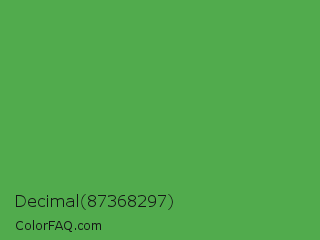 Decimal 87368297 Color is a normal green color and the nearest color is Apple #4fa83d. Hex code #51ab4d and RGB value is rgb(81,171,77). In RGB color space, this color is composed of 32% red, 67% green, 30% blue, In CMYK color space, this color is composed of 53% cyan, 0% magenta, 55% yellow , 33% black , In HSL color space, this color has a hue angle of 117° , 38% saturation and 49% lightness.