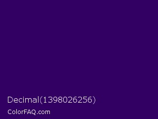 Decimal 1398026256 Color is a very dark violet color and the nearest color is Deep Violet #330066. Hex code #310062 and RGB value is rgb(49,0,98). In RGB color space, this color is composed of 19% red, 0% green, 38% blue, In CMYK color space, this color is composed of 50% cyan, 100% magenta, 0% yellow , 62% black , In HSL color space, this color has a hue angle of 270° , 100% saturation and 19% lightness.