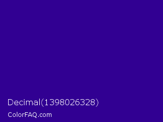 Decimal 1398026328 Color is a dark indigo color and the nearest color is Blue Gem #2c0e8c. Hex code #310092 and RGB value is rgb(49,0,146). In RGB color space, this color is composed of 19% red, 0% green, 57% blue, In CMYK color space, this color is composed of 66% cyan, 100% magenta, 0% yellow , 43% black , In HSL color space, this color has a hue angle of 260° , 100% saturation and 29% lightness.