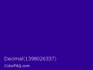 Decimal 1398026337 Color is a dark indigo color and the nearest color is Blue Gem #2c0e8c. Hex code #310095 and RGB value is rgb(49,0,149). In RGB color space, this color is composed of 19% red, 0% green, 58% blue, In CMYK color space, this color is composed of 67% cyan, 100% magenta, 0% yellow , 42% black , In HSL color space, this color has a hue angle of 260° , 100% saturation and 29% lightness.