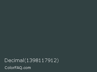 Decimal 1398117912 Color is a dark cyan color and the nearest color is Cape Cod #3c4443. Hex code #314142 and RGB value is rgb(49,65,66). In RGB color space, this color is composed of 19% red, 25% green, 26% blue, In CMYK color space, this color is composed of 26% cyan, 2% magenta, 0% yellow , 74% black , In HSL color space, this color has a hue angle of 184° , 15% saturation and 23% lightness.