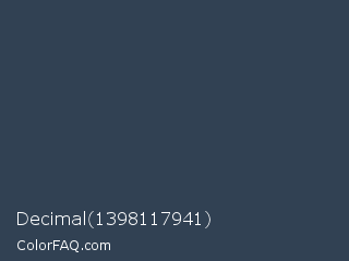 Decimal 1398117941 Color is a dark blue color and the nearest color is Pickled Bluewood #314459. Hex code #314153 and RGB value is rgb(49,65,83). In RGB color space, this color is composed of 19% red, 25% green, 33% blue, In CMYK color space, this color is composed of 41% cyan, 22% magenta, 0% yellow , 67% black , In HSL color space, this color has a hue angle of 212° , 26% saturation and 26% lightness.