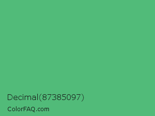 Decimal 87385097 Color is a normal green color and the nearest color is Emerald #50c878. Hex code #51bb79 and RGB value is rgb(81,187,121). In RGB color space, this color is composed of 32% red, 73% green, 47% blue, In CMYK color space, this color is composed of 57% cyan, 0% magenta, 35% yellow , 27% black , In HSL color space, this color has a hue angle of 143° , 44% saturation and 53% lightness.