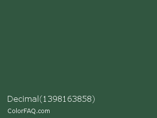 Decimal 1398163858 Color is a dark green color and the nearest color is Hunter Green #355e3b. Hex code #315640 and RGB value is rgb(49,86,64). In RGB color space, this color is composed of 19% red, 34% green, 25% blue, In CMYK color space, this color is composed of 43% cyan, 0% magenta, 26% yellow , 66% black , In HSL color space, this color has a hue angle of 144° , 27% saturation and 26% lightness.