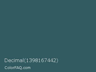 Decimal 1398167442 Color is a dark cyan color and the nearest color is Spectra #2f5a57. Hex code #315960 and RGB value is rgb(49,89,96). In RGB color space, this color is composed of 19% red, 35% green, 38% blue, In CMYK color space, this color is composed of 49% cyan, 7% magenta, 0% yellow , 62% black , In HSL color space, this color has a hue angle of 189° , 32% saturation and 28% lightness.