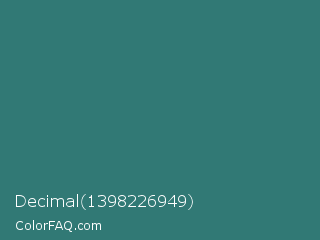 Decimal 1398226949 Color is a normal cyan color and the nearest color is Myrtle Green #317873. Hex code #317975 and RGB value is rgb(49,121,117). In RGB color space, this color is composed of 19% red, 47% green, 46% blue, In CMYK color space, this color is composed of 60% cyan, 0% magenta, 3% yellow , 53% black , In HSL color space, this color has a hue angle of 177° , 42% saturation and 33% lightness.