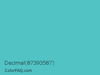 Decimal 87393587 Color is a normal cyan color and the nearest color is Sea Serpent #4bc7cf. Hex code #51c3c5 and RGB value is rgb(81,195,197). In RGB color space, this color is composed of 32% red, 76% green, 77% blue, In CMYK color space, this color is composed of 59% cyan, 1% magenta, 0% yellow , 23% black , In HSL color space, this color has a hue angle of 181° , 50% saturation and 55% lightness.