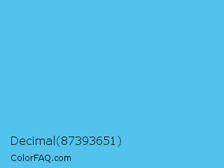 Decimal 87393651 Color is a light blue color and the nearest color is Picton Blue #45b1e8. Hex code #51c3ed and RGB value is rgb(81,195,237). In RGB color space, this color is composed of 32% red, 76% green, 93% blue, In CMYK color space, this color is composed of 66% cyan, 18% magenta, 0% yellow , 7% black , In HSL color space, this color has a hue angle of 196° , 81% saturation and 62% lightness.