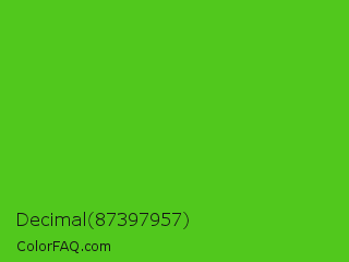 Decimal 87397957 Color is a normal green color and the nearest color is Harlequin Green #46cb18. Hex code #51c81d and RGB value is rgb(81,200,29). In RGB color space, this color is composed of 32% red, 78% green, 11% blue, In CMYK color space, this color is composed of 60% cyan, 0% magenta, 86% yellow , 22% black , In HSL color space, this color has a hue angle of 102° , 75% saturation and 45% lightness.