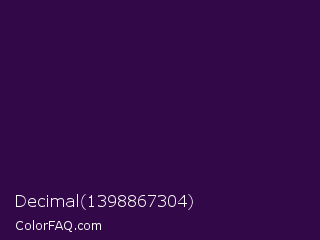 Decimal 1398867304 Color is a very dark purple color and the nearest color is Valentino #350e42. Hex code #320848 and RGB value is rgb(50,8,72). In RGB color space, this color is composed of 20% red, 3% green, 28% blue, In CMYK color space, this color is composed of 31% cyan, 89% magenta, 0% yellow , 72% black , In HSL color space, this color has a hue angle of 279° , 80% saturation and 16% lightness.