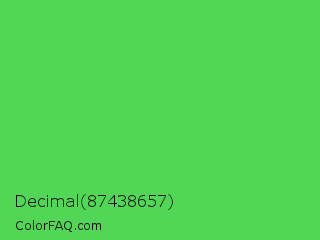 Decimal 87438657 Color is a normal green color and the nearest color is UFO Green #3cd070. Hex code #51d755 and RGB value is rgb(81,215,85). In RGB color space, this color is composed of 32% red, 84% green, 33% blue, In CMYK color space, this color is composed of 62% cyan, 0% magenta, 60% yellow , 16% black , In HSL color space, this color has a hue angle of 122° , 63% saturation and 58% lightness.