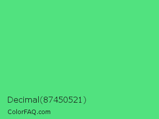 Decimal 87450521 Color is a normal green color and the nearest color is Very Light Malachite Green #64e986. Hex code #51e27f and RGB value is rgb(81,226,127). In RGB color space, this color is composed of 32% red, 89% green, 50% blue, In CMYK color space, this color is composed of 64% cyan, 0% magenta, 44% yellow , 11% black , In HSL color space, this color has a hue angle of 139° , 71% saturation and 60% lightness.