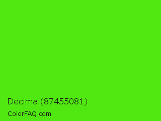 Decimal 87455081 Color is a normal green color and the nearest color is Chlorophyll Green #4aff00. Hex code #51e711 and RGB value is rgb(81,231,17). In RGB color space, this color is composed of 32% red, 91% green, 7% blue, In CMYK color space, this color is composed of 65% cyan, 0% magenta, 93% yellow , 9% black , In HSL color space, this color has a hue angle of 102° , 86% saturation and 49% lightness.