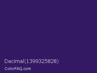 Decimal 1399325828 Color is a dark violet color and the nearest color is Scarlet Gum #431560. Hex code #331964 and RGB value is rgb(51,25,100). In RGB color space, this color is composed of 20% red, 10% green, 39% blue, In CMYK color space, this color is composed of 49% cyan, 75% magenta, 0% yellow , 61% black , In HSL color space, this color has a hue angle of 261° , 60% saturation and 25% lightness.