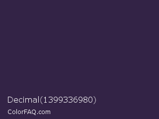Decimal 1399336980 Color is a very dark violet color and the nearest color is Blackcurrant #32293a. Hex code #332346 and RGB value is rgb(51,35,70). In RGB color space, this color is composed of 20% red, 14% green, 27% blue, In CMYK color space, this color is composed of 27% cyan, 50% magenta, 0% yellow , 73% black , In HSL color space, this color has a hue angle of 267° , 33% saturation and 21% lightness.