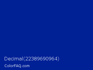 Decimal 22389690964 Color is a dark blue color and the nearest color is Imperial Blue #002395. Hex code #002096 and RGB value is rgb(0,32,150). In RGB color space, this color is composed of 0% red, 13% green, 59% blue, In CMYK color space, this color is composed of 100% cyan, 79% magenta, 0% yellow , 41% black , In HSL color space, this color has a hue angle of 227° , 100% saturation and 29% lightness.