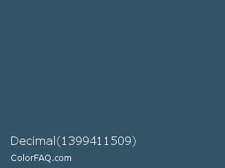 Decimal 1399411509 Color is a dark blue color and the nearest color is San Juan #304b6a. Hex code #335367 and RGB value is rgb(51,83,103). In RGB color space, this color is composed of 20% red, 33% green, 40% blue, In CMYK color space, this color is composed of 50% cyan, 19% magenta, 0% yellow , 60% black , In HSL color space, this color has a hue angle of 203° , 34% saturation and 30% lightness.