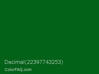 Decimal 22397743253 Color is a very dark green color and the nearest color is Camarone #00581a. Hex code #026217 and RGB value is rgb(2,98,23). In RGB color space, this color is composed of 1% red, 38% green, 9% blue, In CMYK color space, this color is composed of 98% cyan, 0% magenta, 77% yellow , 62% black , In HSL color space, this color has a hue angle of 133° , 96% saturation and 20% lightness.