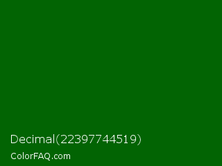 Decimal 22397744519 Color is a very dark green color and the nearest color is Dark Green X11 #006400. Hex code #026403 and RGB value is rgb(2,100,3). In RGB color space, this color is composed of 1% red, 39% green, 1% blue, In CMYK color space, this color is composed of 98% cyan, 0% magenta, 97% yellow , 61% black , In HSL color space, this color has a hue angle of 121° , 96% saturation and 20% lightness.