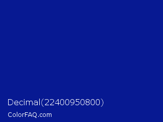 Decimal 22400950800 Color is a dark blue color and the nearest color is Indigo Dye #091f92. Hex code #071992 and RGB value is rgb(7,25,146). In RGB color space, this color is composed of 3% red, 10% green, 57% blue, In CMYK color space, this color is composed of 95% cyan, 83% magenta, 0% yellow , 43% black , In HSL color space, this color has a hue angle of 232° , 91% saturation and 30% lightness.