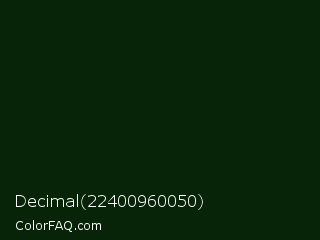 Decimal 22400960050 Color is a almost black green color and the nearest color is Palm Green #09230f. Hex code #072308 and RGB value is rgb(7,35,8). In RGB color space, this color is composed of 3% red, 14% green, 3% blue, In CMYK color space, this color is composed of 80% cyan, 0% magenta, 77% yellow , 86% black , In HSL color space, this color has a hue angle of 122° , 67% saturation and 8% lightness.