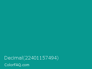 Decimal 22401157494 Color is a normal cyan color and the nearest color is Niagara #06a189. Hex code #079990 and RGB value is rgb(7,153,144). In RGB color space, this color is composed of 3% red, 60% green, 56% blue, In CMYK color space, this color is composed of 95% cyan, 0% magenta, 6% yellow , 40% black , In HSL color space, this color has a hue angle of 176° , 91% saturation and 31% lightness.