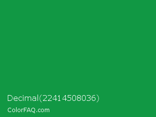 Decimal 22414508036 Color is a normal green color and the nearest color is Spanish Green #009150. Hex code #119844 and RGB value is rgb(17,152,68). In RGB color space, this color is composed of 7% red, 60% green, 27% blue, In CMYK color space, this color is composed of 89% cyan, 0% magenta, 55% yellow , 40% black , In HSL color space, this color has a hue angle of 143° , 80% saturation and 33% lightness.