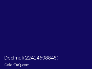 Decimal 22414698848 Color is a very dark indigo color and the nearest color is Arapawa #110c6c. Hex code #120960 and RGB value is rgb(18,9,96). In RGB color space, this color is composed of 7% red, 4% green, 38% blue, In CMYK color space, this color is composed of 81% cyan, 91% magenta, 0% yellow , 62% black , In HSL color space, this color has a hue angle of 246° , 83% saturation and 21% lightness.