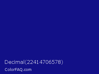 Decimal 22414706578 Color is a dark indigo color and the nearest color is Ultramarine #120a8f. Hex code #121088 and RGB value is rgb(18,16,136). In RGB color space, this color is composed of 7% red, 6% green, 53% blue, In CMYK color space, this color is composed of 87% cyan, 88% magenta, 0% yellow , 47% black , In HSL color space, this color has a hue angle of 241° , 79% saturation and 30% lightness.