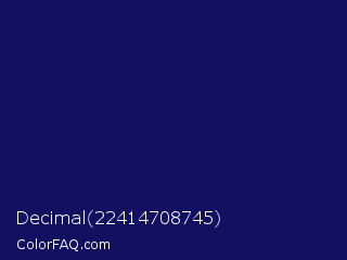 Decimal 22414708745 Color is a very dark indigo color and the nearest color is Arapawa #110c6c. Hex code #121161 and RGB value is rgb(18,17,97). In RGB color space, this color is composed of 7% red, 7% green, 38% blue, In CMYK color space, this color is composed of 81% cyan, 82% magenta, 0% yellow , 62% black , In HSL color space, this color has a hue angle of 241° , 70% saturation and 22% lightness.
