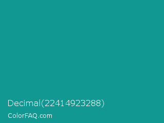 Decimal 22414923288 Color is a normal cyan color and the nearest color is Blue Chill #0c8990. Hex code #129892 and RGB value is rgb(18,152,146). In RGB color space, this color is composed of 7% red, 60% green, 57% blue, In CMYK color space, this color is composed of 88% cyan, 0% magenta, 4% yellow , 40% black , In HSL color space, this color has a hue angle of 177° , 79% saturation and 33% lightness.